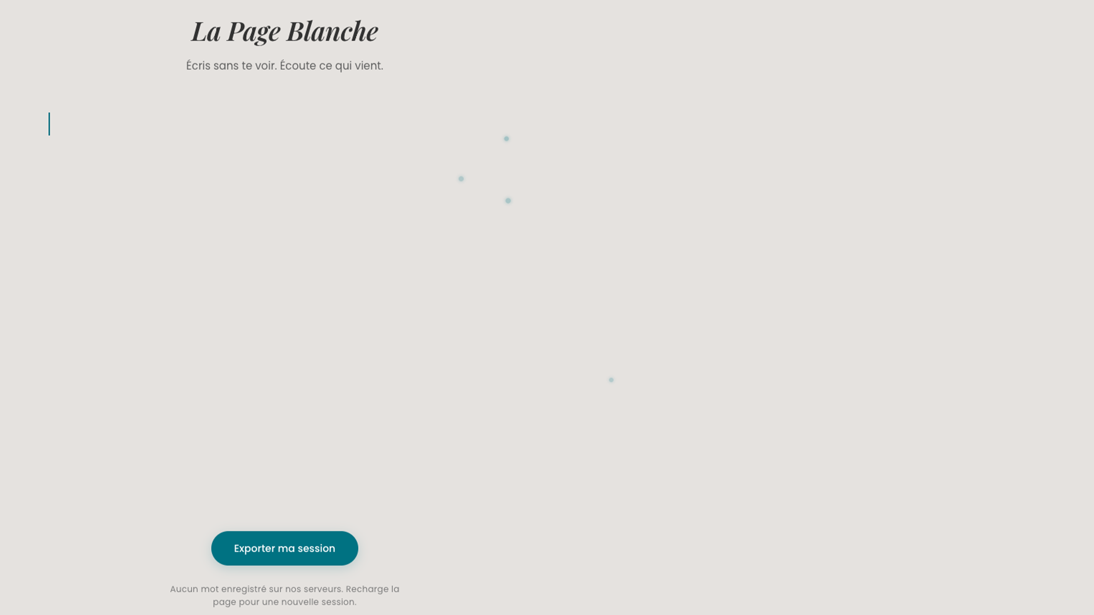 Tu vas sur ybelion.com/page-blanche. Tu tombes sur une page blanche (quelle surprise). Au milieu, un curseur clignote. Tu commences à taper. Et... il ne se passe rien à l'écran. Aucune lettre n'apparaît. Le curseur avance, c'est tout et la page blanche reste blanche (qui aurait pu penser que la page blanche portait en elle sa propre limite ?).